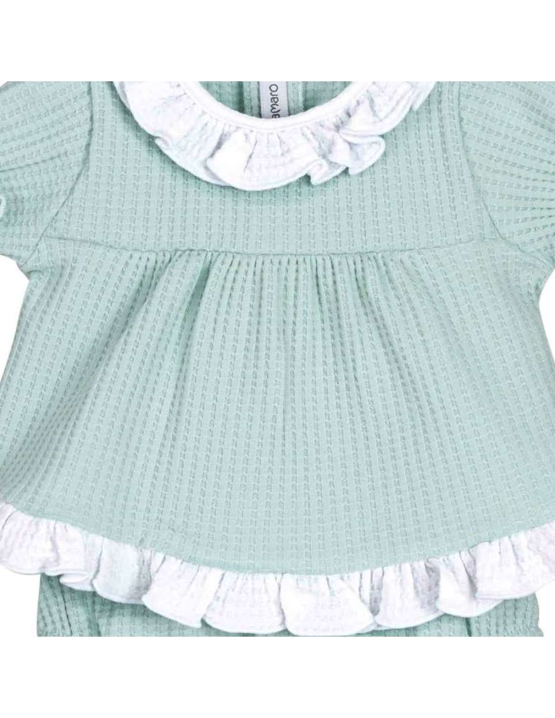 Conjunto Pololo Rodas Mint, diseñado para ofrecer comodidad, suavidad y libertad de movimiento durante la temporada de verano. Confeccionado con una mezcla de 95% algodón y 5% elastano, proporciona un tacto agradable, excelente transpirabilidad y un ajuste flexible que acompaña los movimientos del niño.