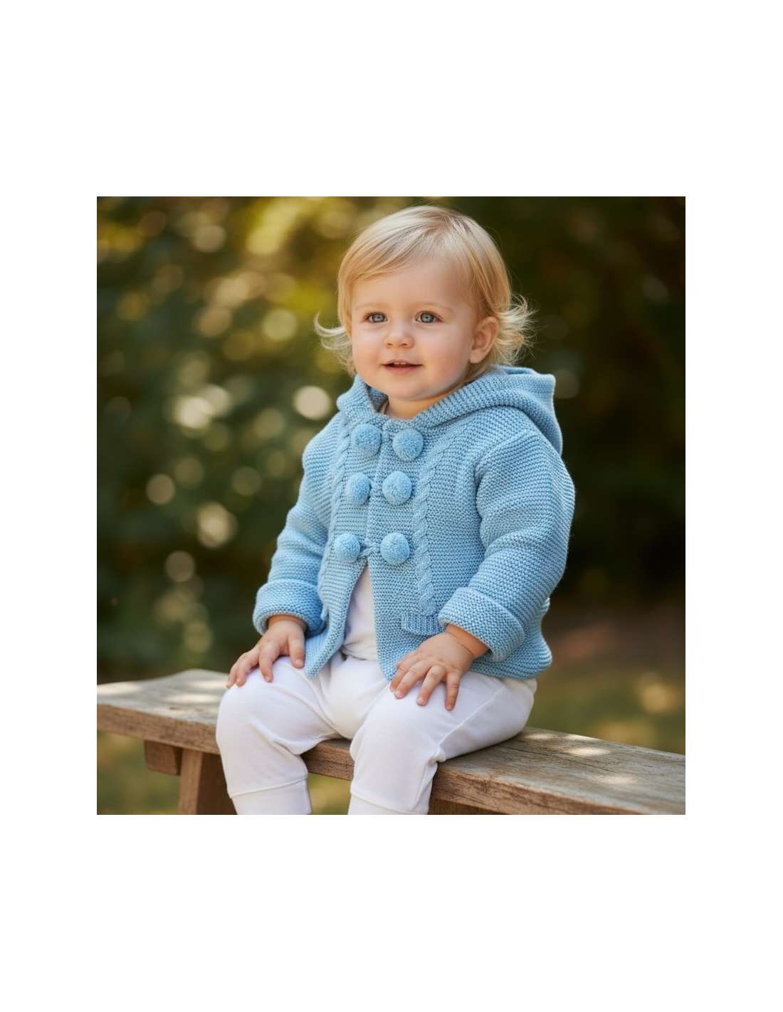 Abrigo de punto azul con capucha para bebé, elegante y cómodo, de la marca Baby Fashion. Perfecto para mantener al bebé abrigado con estilo. Ofrecemos venta al por mayor y realizamos envíos a todo el mundo para que puedas recibir nuestros productos donde los necesites.
