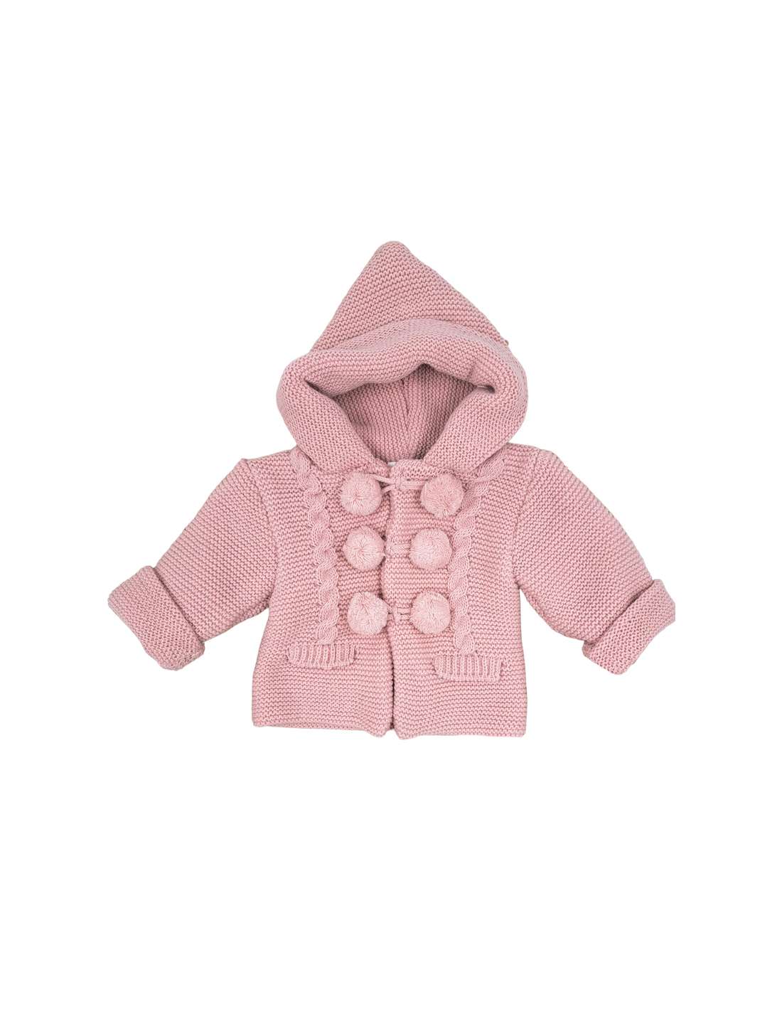 Abrigo de punto en color rosa palo con capucha para bebé, suave, cálido y elegante, de la marca Baby Fashion. Ideal para mantener al bebé abrigado con estilo y comodidad. Ofrecemos venta al por mayor y realizamos envíos a todo el mundo para que recibas nuestros productos donde los necesites.