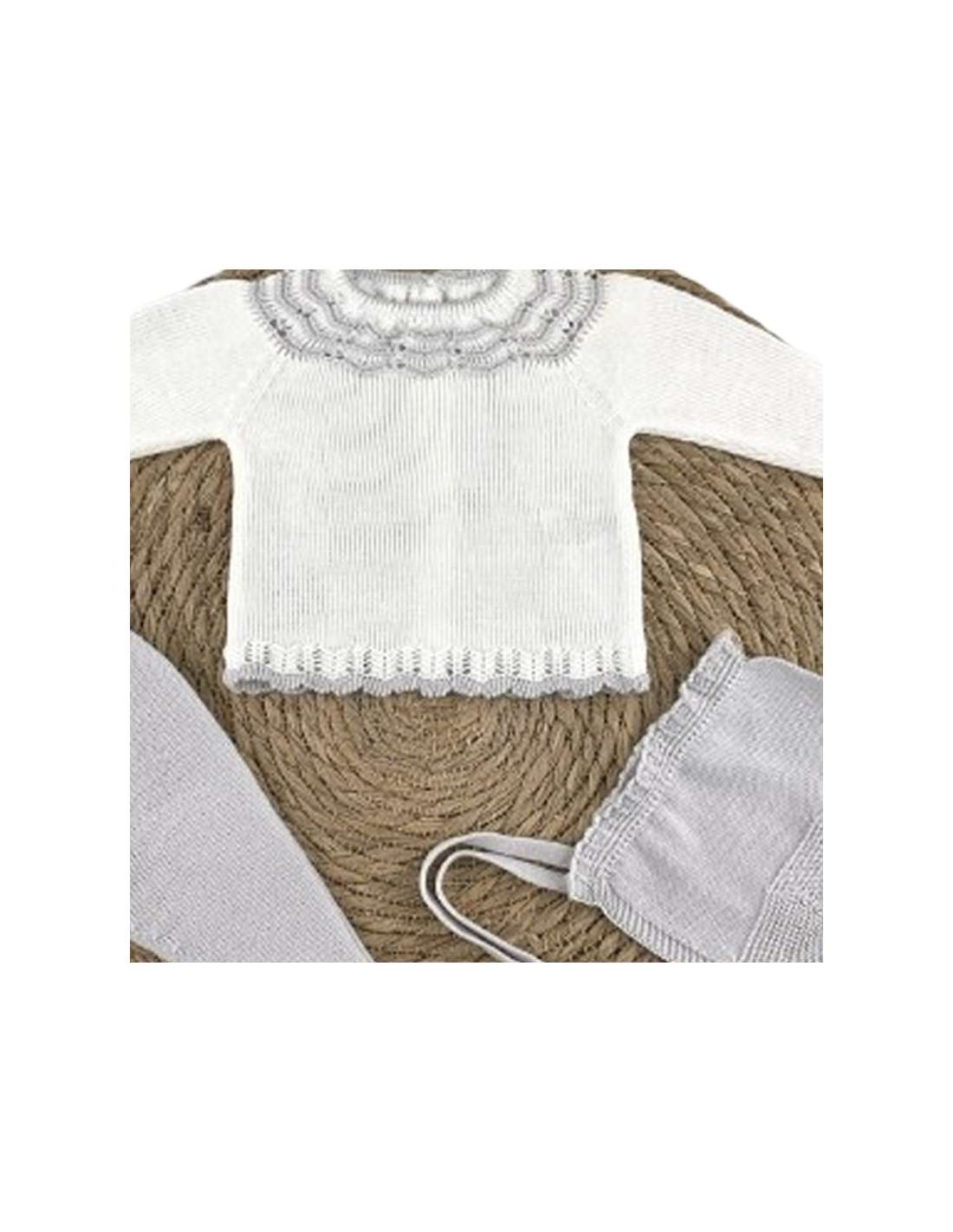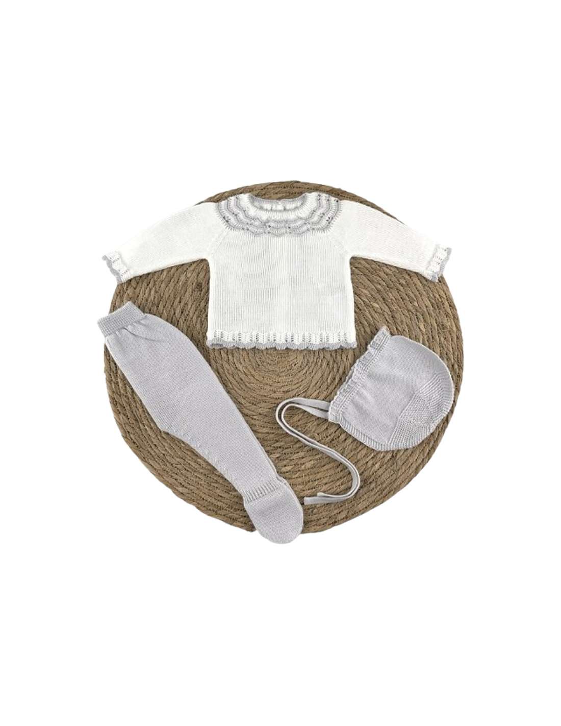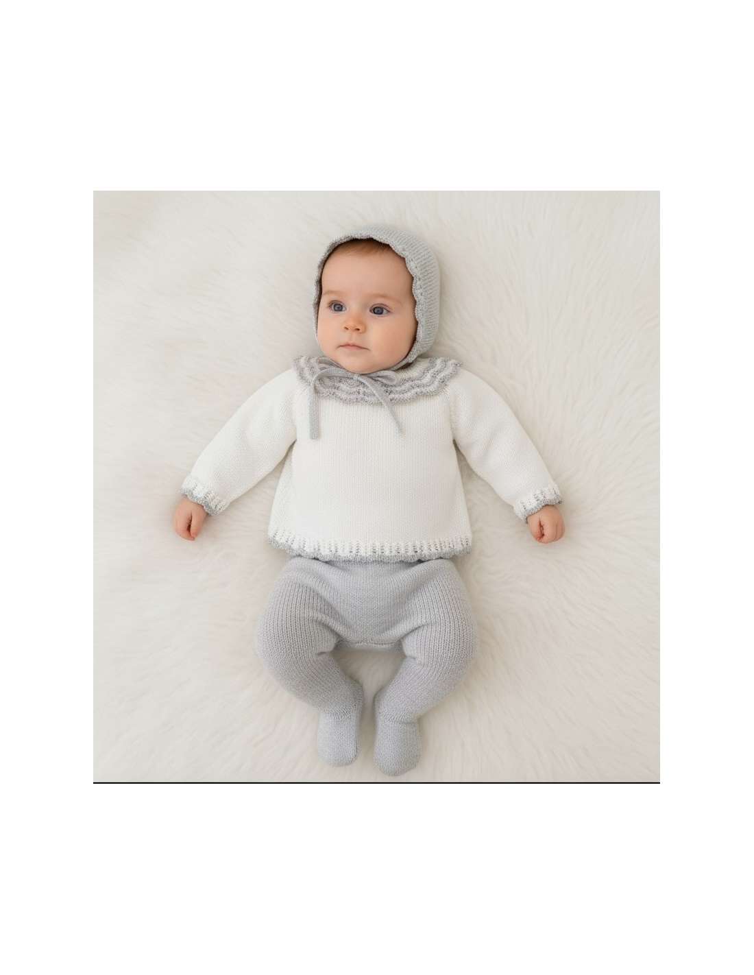 Conjunto de bebé en hilo de alta calidad en tonos blanco y gris, ideal para la temporada otoño/invierno 2025. Este diseño exclusivo de la marca Diverchic combina elegancia y confort, con acabados delicados y tejidos suaves que cuidan la piel del bebé. Fabricado 100% en España, representa el equilibrio perfecto entre estilo clásico y tendencias actuales. Disponible solo para venta al por mayor, ideal para boutiques y tiendas infantiles que buscan productos de calidad diferenciada para su catálogo.