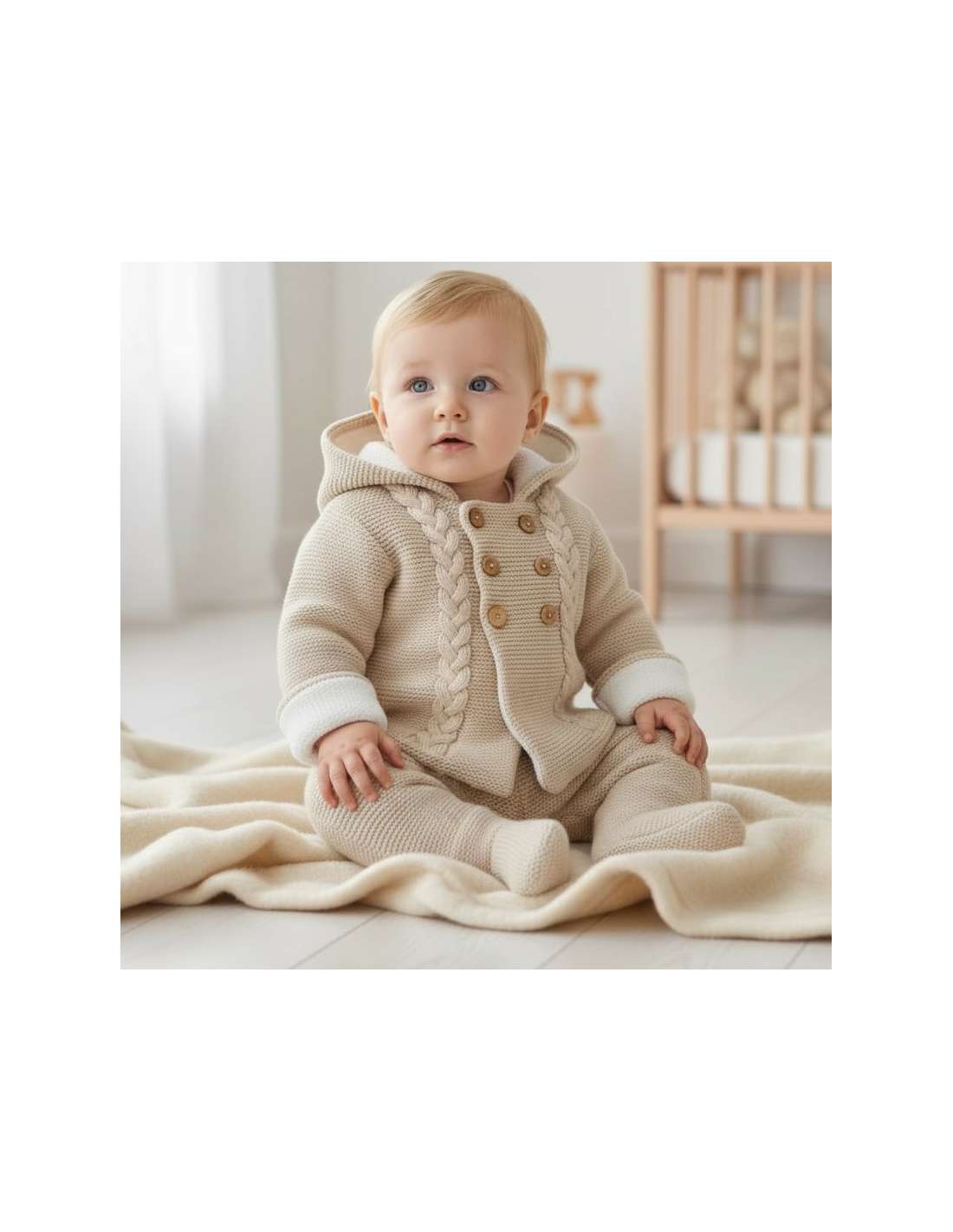 Lana y Perlé 550.2 CRUDO ABRIGO DE PUNTO CON CAPUCHA MARCA BABY FASHION 550.2 RAW Fabricado en España View 24 M 36 M