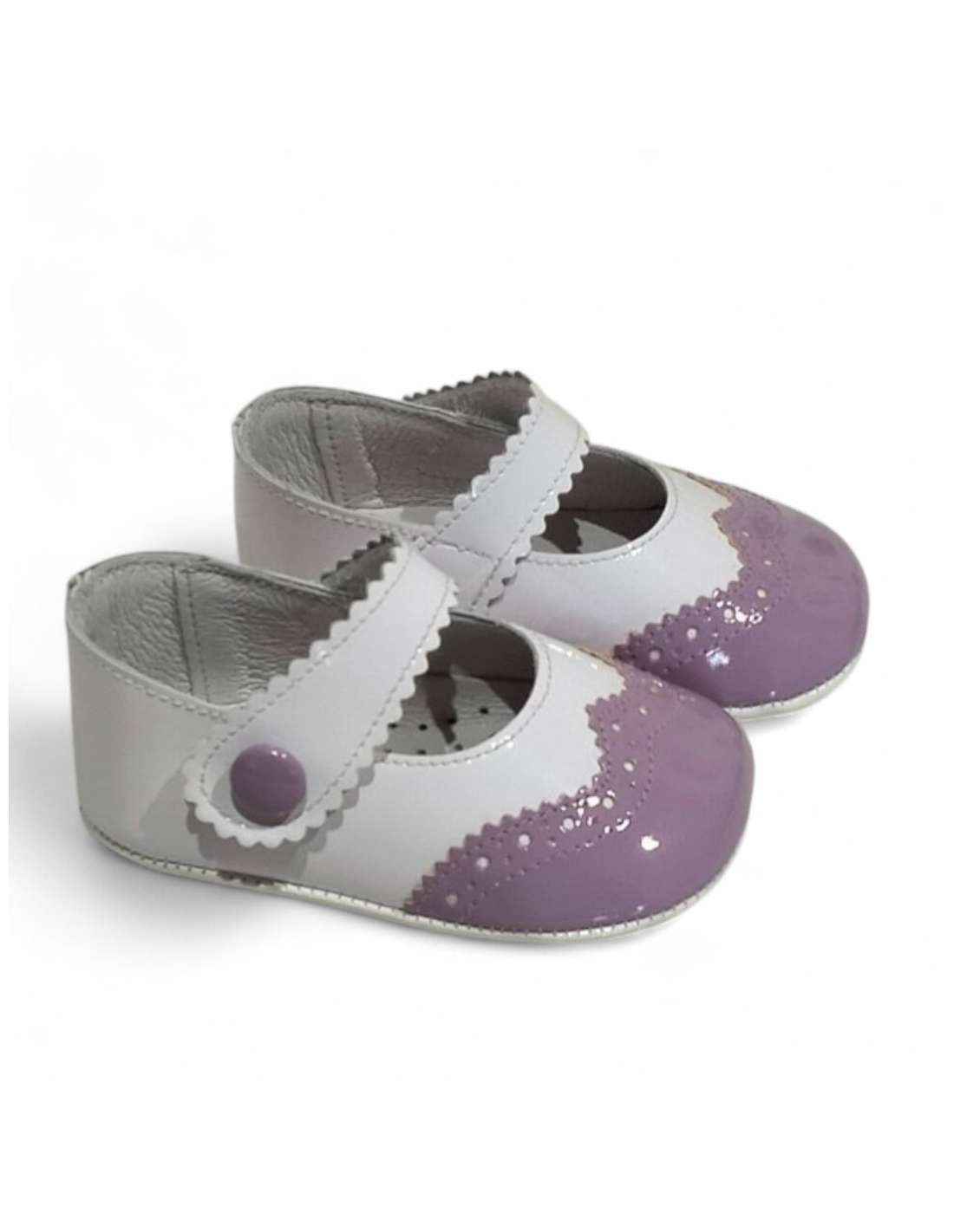 Peuque de bebé confeccionado en piel charol de color lila con diseño bicolor, pensado para brindar estilo, suavidad y confort desde los primeros meses. Su acabado brillante y delicado lo hace ideal para boutiques infantiles que buscan calzado exclusivo y de alta calidad. Fabricación artesanal, materiales premium y atención al detalle. Ofrecemos venta al por mayor con envíos internacionales seguros y atención personalizada.