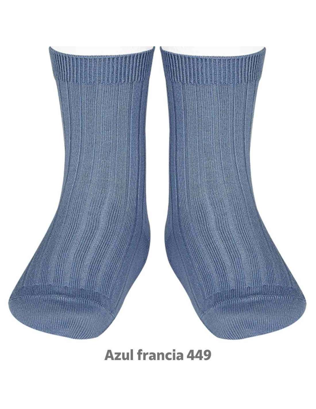 Short ankle socks made from ribbed knit fabric in a sophisticated French blue color. A timeless essential garment that stands out for its comfort, perfect fit, and excellent quality. Its classic design and vibrant tone make it the perfect accessory to pair with any outfit in your wardrobe, adding a stylish and distinctive touch.