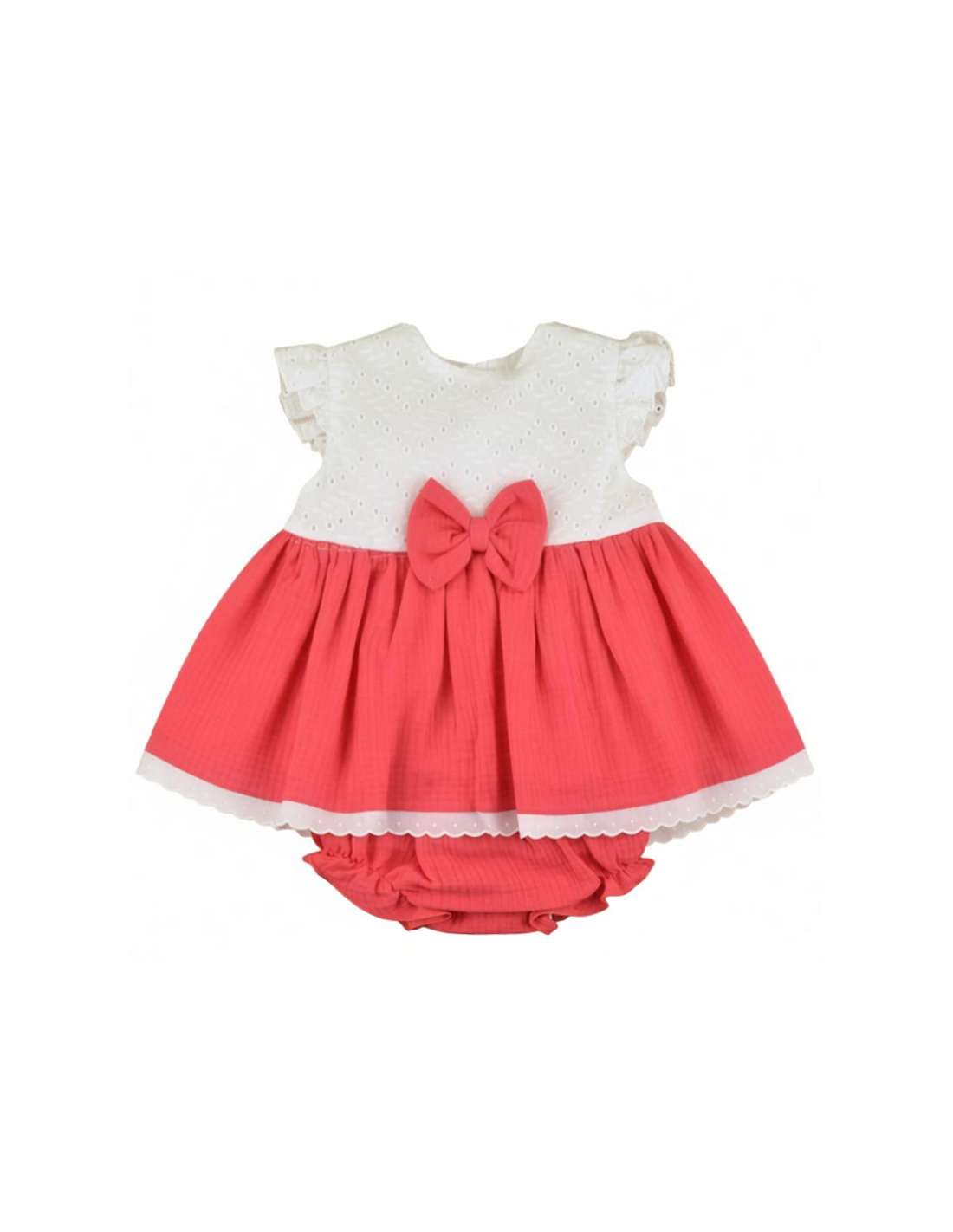 Baby outfit consisting of a cardigan with decorative bow and matching bloomers in an elegant ruby shade, designed to ensure comfort, freshness and a refined look during the summer season.