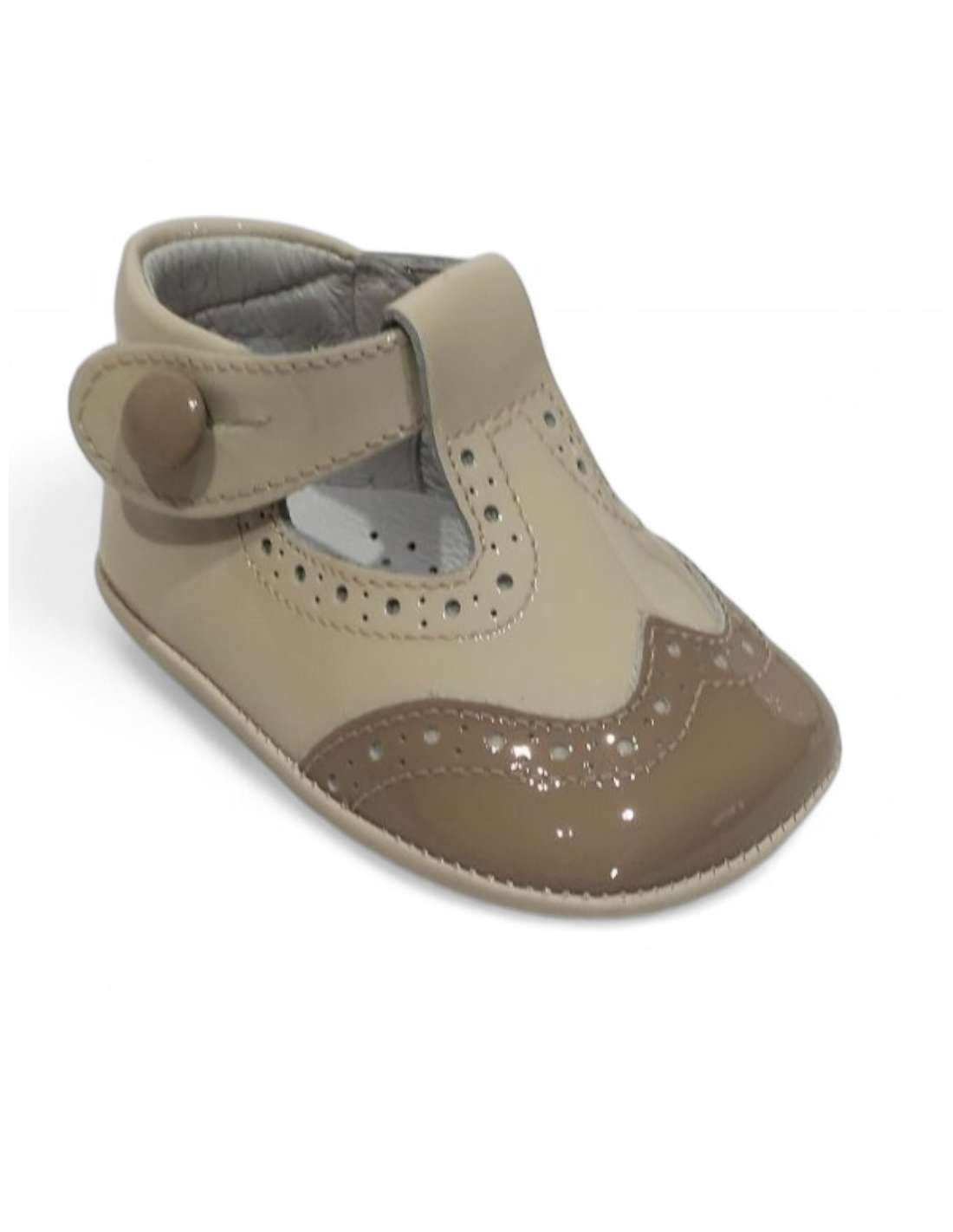 T-bar baby shoe made from brown patent leather with a stylish two-tone design. Offers a perfect blend of traditional charm, comfort, and a secure fit. The glossy finish and classic T-strap make it suitable for everyday wear or formal occasions. Handcrafted with top-quality materials, ideal for boutiques and distributors looking for premium baby footwear. Available for wholesale with safe and fast international shipping and dedicated support.