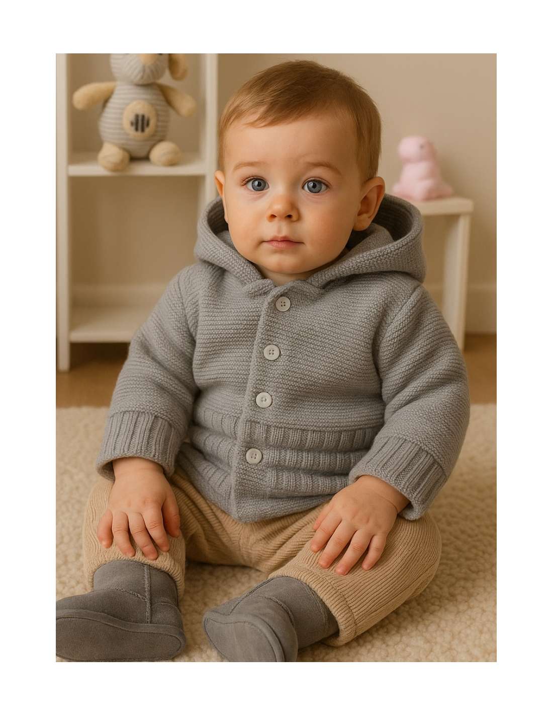 Wool and perle thread 599.16 GREY KNITTED COAT WITH BONNET 599.16 GREY Made in Spain View 3 M 6 M 12 M 18 M
