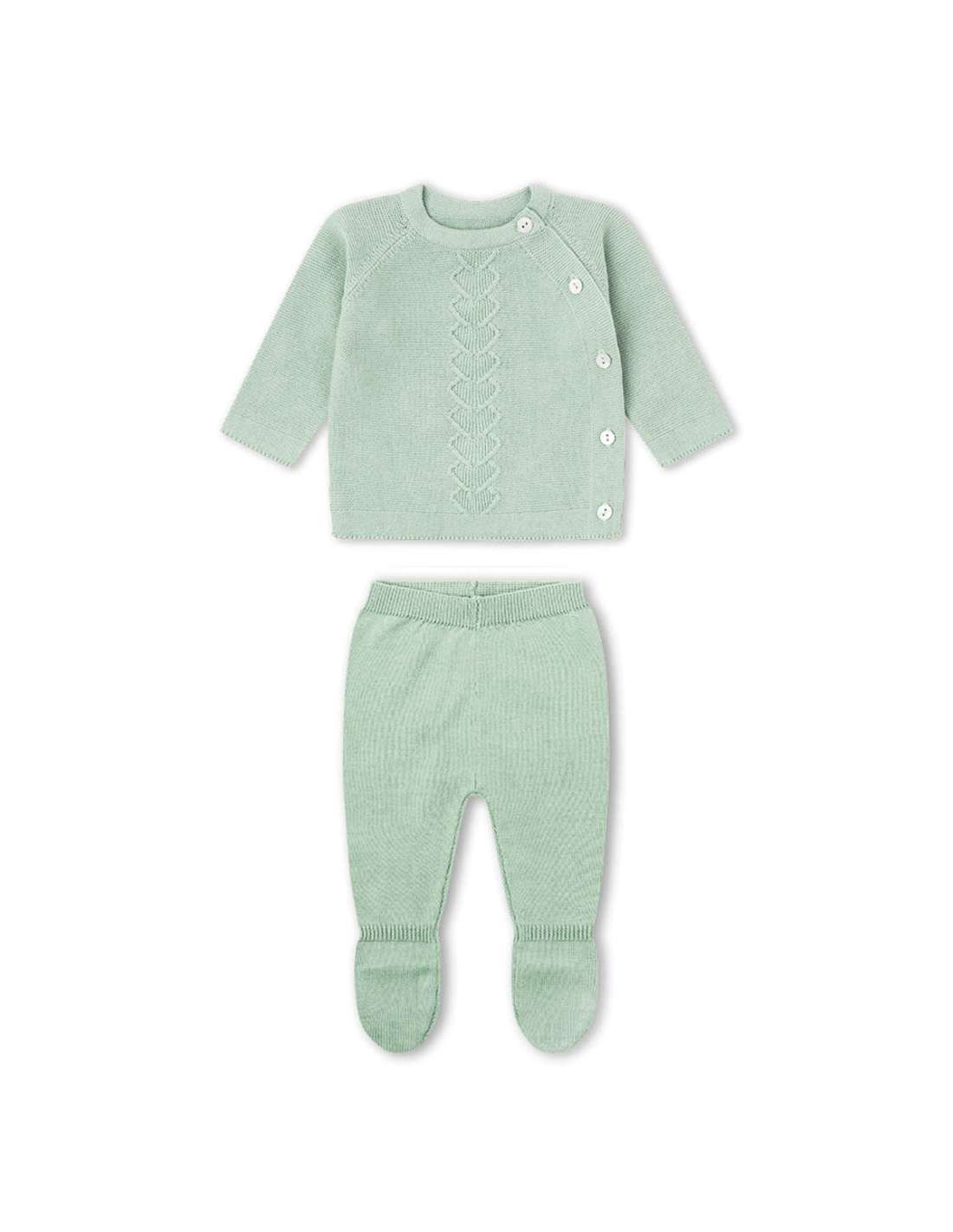 This two-piece set includes a matching sweater and pants, creating a simple, functional, and delicate look. It is designed to provide softness, comfort, and freedom of movement, ensuring the baby’s well-being at all times.